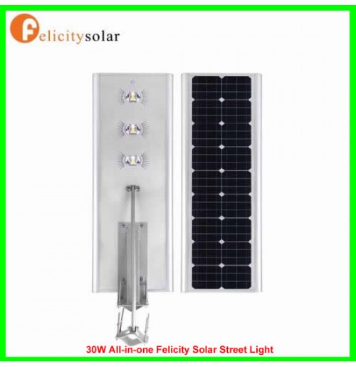 This integrated 30W All-in-one Felicity Solar Street Lights are a type of solar lighting products which integrate the solar panel, controller, lithium batteries and led light source into one integral unit.