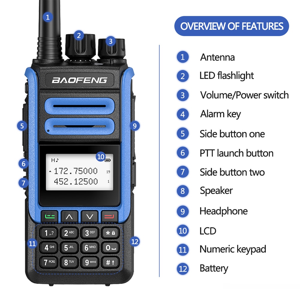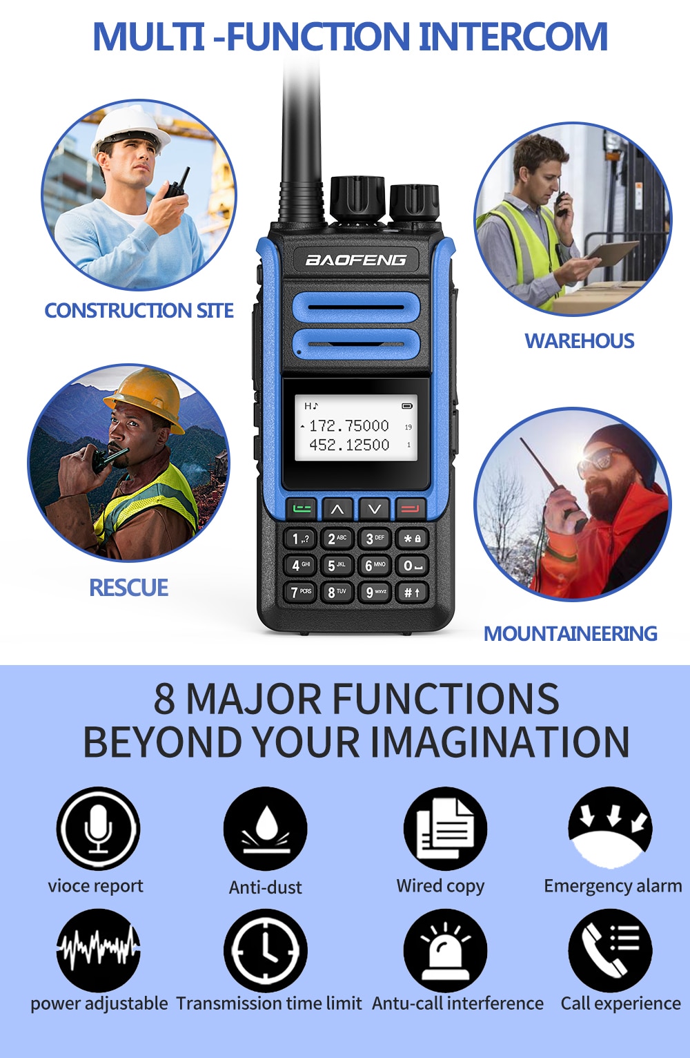 Professional Ham Radio: Frequency range:VHF:136-174MHz(RX/TX),UHF:400-520MHz(RX/TX),Up to 128 channels. Dual-band handheld transceiver with display function menu on the display “LCD”. This solid 10W Power radio can reach further and receives strong signals.