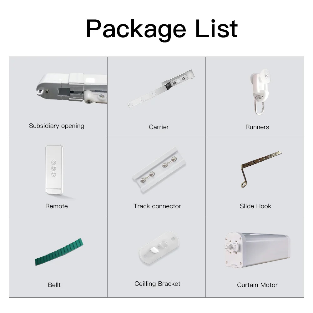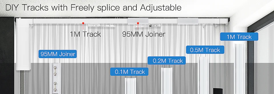 DIY tracks with splicing available:Start with 1 meter DIY track to splice freely for adding 5m*1+0.2m*2+0.1m*1to meet your own demand with any length.Packed with Remote (battery not included).Set the working schedule on your smart phone previously to allow your curtain to go up and down automatically with adjustable tracks.
