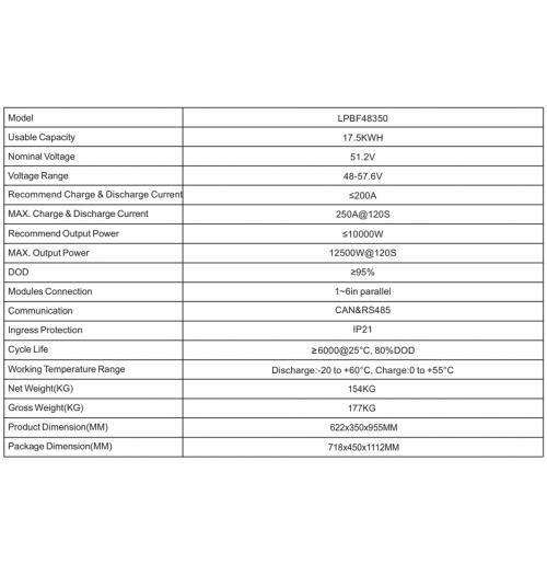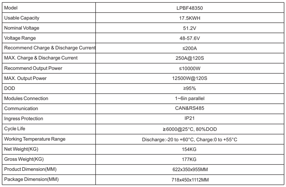 Felicity 17.5KWH 51.2V 350Ah Lithium Battery Specifications: